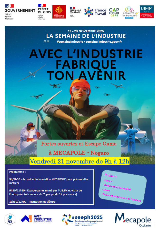 Dans le cadre de la Semaine de l’Industrie, la Team RH Occitanie et ses partenaires vous invitent à une matinée de découverte des métiers industriels, le vendredi 21 novembre 2025 de 9h à 12h, à Mécapôle – Nogaro (Gers).